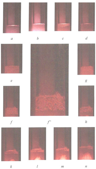 On frame h (Figure 2), an expanding elastic shell of the active volume of the hydrogen–oxygen mixture is visible in the lower-left corner of the frame. Measurements have established a small dependence of the pulse transfer rate on the tube diameter in the investigated range (about 2900 m/s).