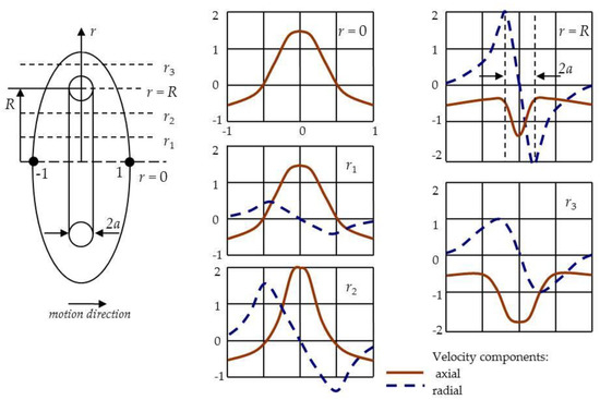 Let us take a closer look at the VR structure. The maximum velocities vx of each of the sections lie in the plane x = 0 passing through the circular axis of the vortex (Figure 10). In this plane, |vx| > |v0| except for the area close to the circular axis. At infinity, vx tends asymptotically to v0. The maximum values of the vr velocities are localized on the cylinder r = D/2, vanishing at x = 0. At infinity, vr tends to 0.