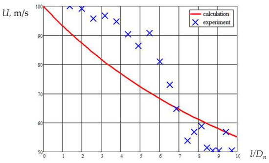 To improve the visual display of the rings, high-intensity illumination and a white substrate were used, so that in the future, not the rings themselves but their shadow displays on the substrate were processed. The processing was performed in the Phantom Camera Control Application program using the built-in tools for measuring the geometric characteristics of the image. The initial moment of time was taken as the moment of the final ring formation, which occurred 0.85 ms after the start of the exit of the colors’ flow from the nozzle of the impact pipe at a distance from the cutoff of ≈1.3 of the nozzle diameter. Next, the distance traveled by the ring from the nozzle section of the shock tube was determined with a step of Δt = 0.25 ms. The average speed of the ring over the traversed interval Δl was determined as the ratio Δl/Δt.