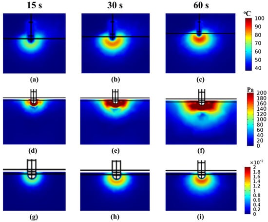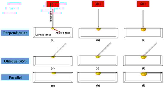Propagation of ablation zone during 60 s of cardiac ablative procedure for: (a–c) perpendicular (90°), (d–f) oblique (45°), and (g–i) parallel (0°) configuration of electrode.