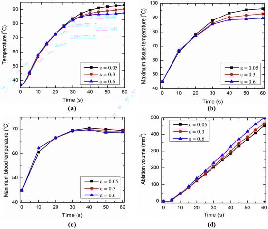 In this study, porous media theory has been used for modeling the heat transport within the cardiac tissue during RF assisted cardiac ablation. Notably, LTE formulation has been used, which assumes the temperature of the tissue phase locally equal to the blood phase within the porous medium. Moreover, the porosity of the biological tissue is likely to change during the minimally invasive thermal ablative procedure owing to the natural body temperature regulation system that controls the body temperature by regulating blood flow within the porous biological structure []. This regulation system could increase or decrease the porosity of the biological medium, and hence effective thermal conductivity of the porous medium, based on the temperature changes induced within the tissue during thermal ablation. Thus, we have quantified the effect of changes in porosity on the tissue and blood temperature distributions, and the attained ablation volume during the cardiac ablation procedure. Motivated by [,,], three values of porosity have been selected for the biological tissue, viz., ε = 0.05, 0.3, 0.6. Importantly, in the present study the ablation volume refers to the volume of cardiac tissue having a temperature greater than or equal to 50 °C [,,,,]. Figure 3a presents the temporal variation of temperature at a point 1 mm away from the tip of the electrode along the line of electrode insertion for different values of porosity of cardiac tissue. As evident from this figure, the changes in porosity do not affect the predicted temperature profile approximately till first 30 s of the RF assisted cardiac ablation. Beyond that there prevails a significant variation in the temperature profile for considered values of porosity. The increase in porosity from 0.05 to 0.6 decreases the magnitude of temperature by 5.37 °C after 60 s of cardiac ablation. The effect of variation in cardiac tissue porosity on the maximum tissue and blood temperatures have been presented in Figure 3b,c, respectively. Again, the variation of the maximum tissue temperature for different values of porosity is negligible up to first 30 s of cardiac ablation and it eventually increases thereafter. The change in porosity from 0.05 to 0.6 results in a decline of 6.86% in the predicted value of the maximum temperature attained within the tissue after 60 s of cardiac ablation. The varying cardiac porosity has very negligible influence on the maximum blood temperature, as evident from Figure 3c. Moreover, as seen from Figure 3a–c the temperature distributions in both tissue and blood increase with an increase in heating time during the cardiac ablative procedure. Initially, the increase in temperature is asymptotic, which later stabilizes with the passage of time. Further, both tissue and blood temperature distributions follow similar trends, however the rise in blood temperature is significantly less than the tissue temperature due to the different RF powers absorbed within the tissue and blood during the cardiac ablation. Figure 3d presents the temporal variation of ablation volume attained during the 60 s cardiac ablation procedure. As evident, the ablation volume predicted with ε = 0.6 is significantly higher as compared to ε = 0.05. This can be attributed to the fact that the higher porosity of the cardiac tissue will result in higher volumetric transfer area between the blood and the tissue, resulting in higher ablation volume during the cardiac ablation. Thus, the variation in the porosity significantly affects the predicted outcomes of the cardiac ablation and must be accounted for obtaining accurate, precise and realistic predictions of tissue and blood temperatures as well as the attained ablation zone.