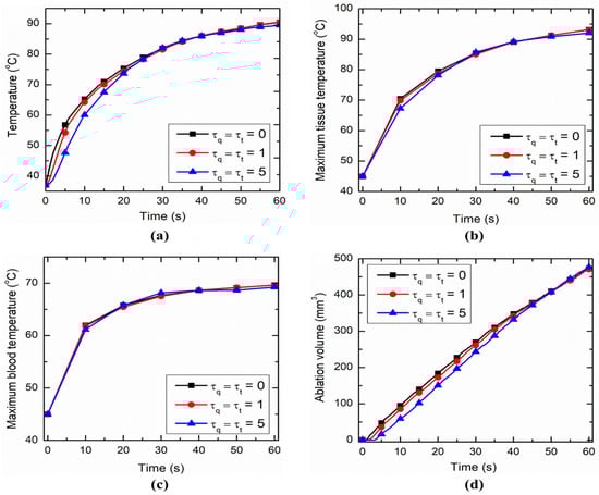 As inferred from Figure 4a, there prevails significant deviations among the predicted values of the temperature for first 30 s of the cardiac ablation for different values of τq and τt. Eventually, beyond 30 s of ablation, the deviation between the predicted temperature for different values of thermal relaxation time diminishes with the passage of time. Similar variations have been seen in the ablation volume profile presented in Figure 4d. Moreover, the non-Fourier characteristics have a negligible effect on the maximum tissue and blood temperatures during the 60 s long cardiac ablation, as depicted in Figure 4b,c, respectively. Thus, for shorter duration of cardiac ablation, less than 30 s or so, the thermal relaxation times could significantly affect the predicted ablation volume, while for treatment times greater than 30 s, ablation volume is not sensitive to the value of thermal relaxation times.