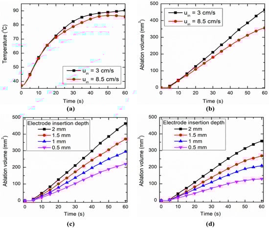 Temporal variation of: (a) temperature at a point 1 mm away from tip of electrode, and (b) ablation volume for different values of blood flow rates. (c) Comparison of ablation volumes predicted with different insertion depth of the electrodes for low blood flow rate and (d) high blood flow rate conditions.