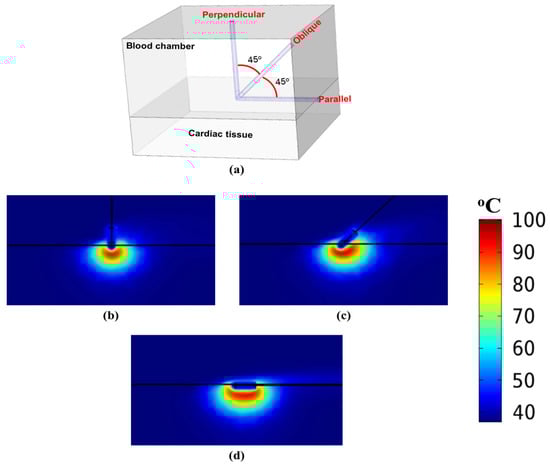 (a) Schematic of three different orientations of the RF electrode with respect to cardiac tissue. Temperature distribution obtained after 60 s of cardiac ablation with: (b) perpendicular (90°), (c) oblique (45°), and (d) parallel (0°) orientations of the electrode.
