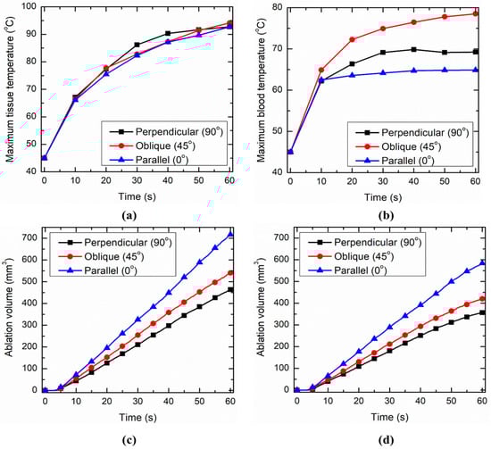 Temporal variation of: (a) maximum tissue temperature, and (b) maximum blood temperature for different orientations of electrodes. Comparison of ablation volumes predicted with different orientations of the electrodes for: (c) low blood flow rate, and (d) high blood flow rate conditions.