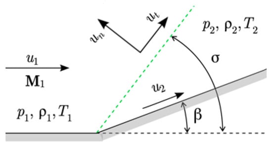 An oblique shock wave in a supersonic flow is a gas dynamic discontinuity (stationary shock wave) located at an angle to the incident flow. A shock located at an angle σ compresses the incoming flow and orientates it at a certain angle β (
