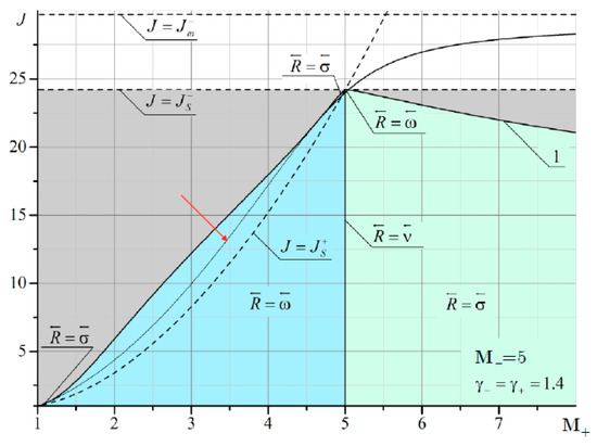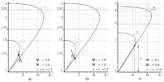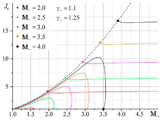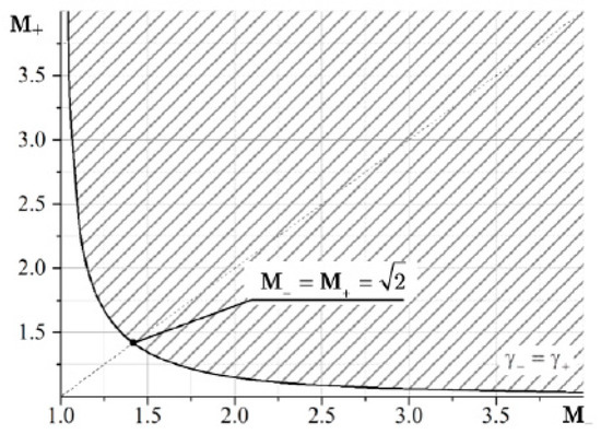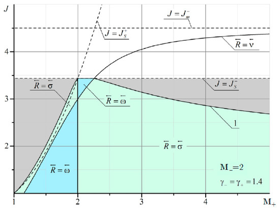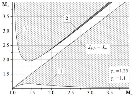 Figure 8 shows the dependence of the intensity of the incident shock wave corresponding to the characteristic refraction. It is seen that there are solutions with one and two roots of Equation (14). The three roots are not physically realized.