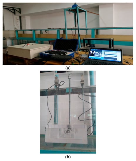 During the operation of a floating structure in flowing water, the factors affecting the hydrodynamic moment mainly include the shape of the floating structure, the draft depth of the structure, and the hydraulic conditions. According to the factors affecting the hydrodynamic moment in hydraulic engineering, indoor experiments were established, and the main parameter conditions were analyzed. Flume experiments involving a self-circulating water supply system were performed to study the hydraulic characteristics and patterns of the hydrodynamic moment of a floating structure; the flume was made of plexiglass with a smooth surface. The moment and hydraulic parameters were measured under steady flow conditions. The experimental configuration is presented in Figure 1a; as shown in Figure 1b, the floating structure was set in the central area of the flume. With the width of the floating structure perpendicular to the flume being 0.30 m, water flowed downstream beneath the structure rather than around it. An independently developed stepper motor and computerized numerical control (CNC) speed control system was used to control the position of the floating structure at an accuracy of 0.10 mm. The upstream and downstream water levels of the model were measured using needle water level gauges with a measurement accuracy of ±0.10 mm. Typical velocities were obtained by an acoustic Doppler velocimeter at an accuracy of 0.01 cm/s, and the acquisition frequency was 200 Hz [,]. The flow characteristics around the floating structure were observed along the longitudinal section.