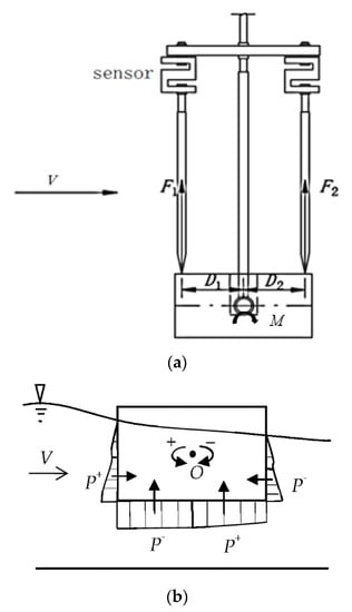 To measure the hydrodynamic moment of the structure, the fixed floating structure capable of both sinking and floating was connected to a rotating rod set at the geometric center of the structure to ensure that the structure could freely (but only slightly) rotate along the direction of the water flow, and a tension pressure sensor was arranged along the center line of water flow at each end (upstream and downstream) of the upper part of the structure. The sensor was a CY201 digital pressure and temperature transmitter with an accuracy of ±0.50‰, and the acquisition frequency was 512 Hz. When a floating structure is under the action of flow, it rotates along the direction of the flow; therefore, the hydrodynamic moment can be calculated by the pressure values output from the tension pressure sensors (see Figure 2). The pressures on the two sensors are denoted F1 and F2, and the distances from the center of the structure to the sensors are denoted D1 and D2, respectively. The hydrodynamic moment was calculated with clockwise being negative and counterclockwise being positive as follows: