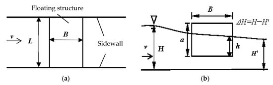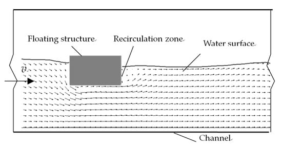 There is an increasing trend in the applications of floating structures in inland water conservancy projects, such as inland navigation and flood control, as well as in marine engineering [,]. Such structures usually span a finite area (e.g., a river) with a large length-to-width ratio and exhibit characteristics similar to those of ships, offshore platforms and sluices. However, the flow patterns of such structures are variable, and their hydrodynamic mechanisms are complex [,]. The hydrodynamic moment on the surface of a floating structure is generated by the action of the flow and can easily cause the structure to overturn. Consequently, studies on the stability of floating structures have focused primarily on the forces, influencing factors, and responses of such structures.