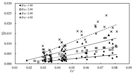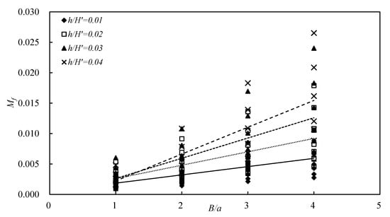 Figure 5 shows a scatter diagram relating the dimensionless hydrodynamic moment Mf to the structure shape parameter B/a under the same hydraulic conditions. With increasing B/a, Mf increases. During the experiment, with increasing B/a, the flow velocity decreases significantly near the center of the structure’s lower surface. The small recirculation zone near the lower center of the structure expands to the back half of the structure. When the shape parameter of the floating structure increases, the surface pressure difference caused by the uneven distribution of the dynamic pressure increases, and the distance between the action point and the center of the structure also increases, resulting in a rise in the hydrodynamic moment. For a larger structure, the pressure drop from the entrance of the bottom gap to the downstream part increases, causing an increased pressure difference and giving rise to the hydrodynamic moment.