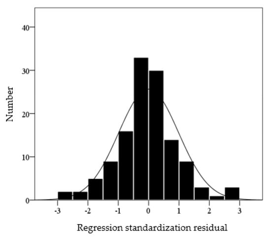 The standard residuals need to satisfy the requirements of randomness and normality to confirm the correctness of the obtained formula. The following results were obtained by analyzing the standard residuals. Figure 9 illustrates the corresponding statistical analysis of the residuals of Equation (9) and a histogram of the residuals with a normal probability curve; the residuals present a normal distribution. The 95% distribution of standardized residuals is between −2 and +2, which suggests that the model assumptions are reasonable.