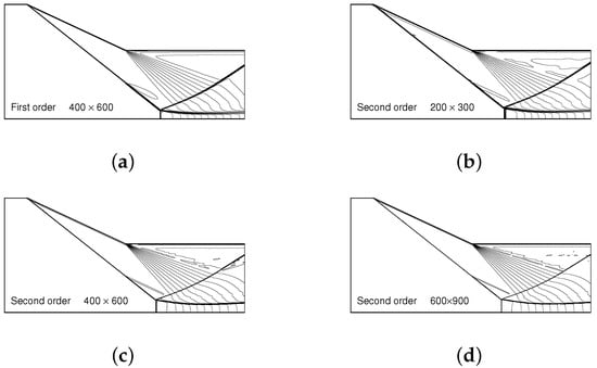 Mach number contours for , and : (a) first order with a mesh; (b) second order with a mesh; (c) second order with a mesh; and (d) second order with a mesh.