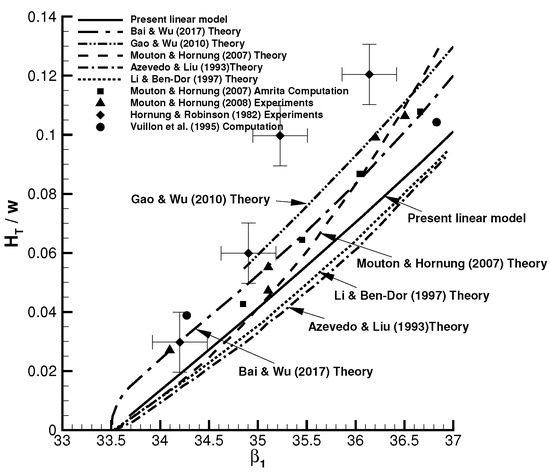 The experimental data of Hornung and Robinson [18] are usually used for comparison. Here, we consider their case with and , with the varying incident shock angle (). Figure 7 displays the comparison of the Mach stem height expression (25) with some various previous works. In Figure 7, the experimental data of Hornung and Robinson [18] and Mouton and Hornung [27], and the CFD data of Mouton and Hornung [21], and Vuillon et al. [6] are displayed. It can be seen that the expression (25) provides a curve lying between the curves of Bai and Wu [23] and Gao and Wu [22].