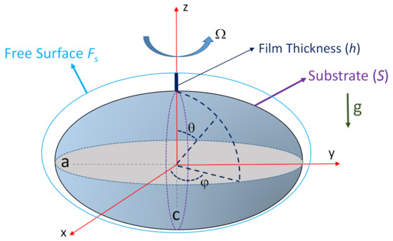 We consider a thin liquid film on the outer surface of a spheroid (bi-axial ellipsoid), whose horizontal and vertical semi-axes are denoted by a and c, respectively. The liquid is assumed to be incompressible and Newtonian, characterized by its density , surface tension , and dynamic viscosity . In addition to gravitational, viscous, and capillary forces, the system is also subjected to rotation around the vertical axis, at a constant angular velocity . A sketch of the problem is shown in Figure 1.