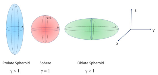 is the ratio of the vertical to horizontal semi-axes, and is hereafter referred to as the geometric parameter. The geometric parameter corresponds to three types of spheroids—namely, an oblate spheroid for , a sphere for , and a prolate spheroid for (see Figure 2). The principal curvatures and are expressed by the geometric parameter and the metric coefficients: