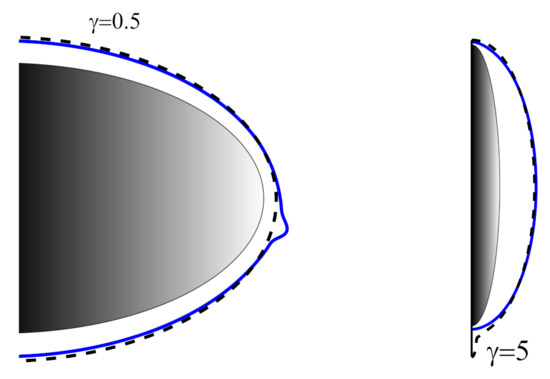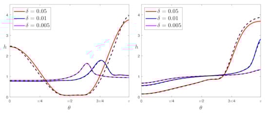 In this section, several cases are presented to confirm the consistency of the results obtained with the lubrication model (5) and the full NS equations. In accordance with Lee et al. [24], we set the physical parameters for VPS-32 as follows: initial film thickness mm, density kg/m, dynamic viscosity parameters kg/m.s, s, , s, acceleration of gravity m/s, surface tension N/m, and angular velocity rad/s. While the Bond number was fixed () for the physical parameters given above, the geometric parameter was varied to consider both oblate and prolate spheroids, for and , respectively. Likewise, the film parameter was varied by considering different sizes of the horizontal semi-axis ( m, m, and m) to determine a threshold value of the film parameter, which ensured the accuracy of the model for . Note that as and vary, the vertical semi-axis c and the dimensionless angular velocity also varied accordingly. Figure 3 displays the dimensionless film thickness profiles at s, where the solutions of the lubrication model (solid line) and the full NS equations (dashed line) are represented in dimensionless form simultaneously. The left panel of Figure 3 exhibits the steady thickness profiles on an oblate spheroid for , and the right panel represents the profiles on a prolate spheroid for . Three values of the film parameter are considered in each panel (, , and ), to demonstrate that the lubrication model is in excellent agreement with the NS equations for but visibly degrades for larger values of .