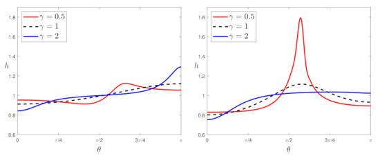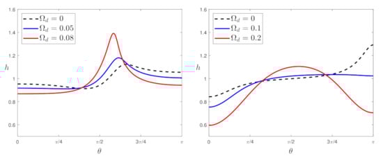 Variations in the steady thickness profiles for , where the angular velocity varies on the spheroid. (left) Oblate spheroid , angular velocity ; (right) Prolate spheroid , angular velocity .
