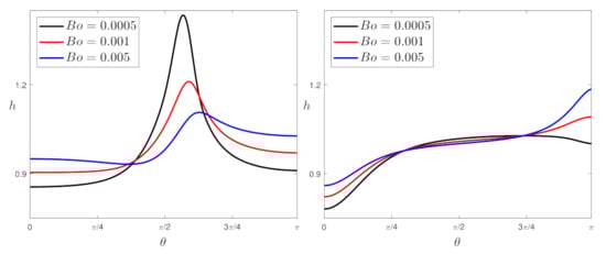 Next, we report the comparative effect of the gravitational force against surface tension, by examining the deviations of the film thickness profiles via the Bond number. Figure 7 shows the steady thickness profiles for the fixed value of the dimensionless angular velocity , where the Bond number is set to and . As the Bond number increases, the gravitational effect is more pronounced compared to surface tension. The left panel of Figure 7 illustrates the steady film thickness distribution for , and indicates that an almost symmetric steep hump emerges for relatively small Bond numbers, whereas symmetry is broken when the Bond number increases. On the contrary, for (right panel of Figure 7), rotation does not induce any hump formation about the equator for the investigated values of and . For both and , the thickness at the north and south poles increases with .