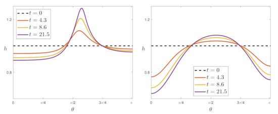 Lastly, we represent a typical temporal evolution of the film thickness in Figure 8. Profiles are shown for the dimensionless times , and , where in this case represents the final steady state. The left panel of Figure 8 shows the evolution for an oblate spheroid rotating at , and the right panel shows the evolution for a prolate spheroid rotating at . In both cases, we observe a thickening at the equator and a thinning at the poles.