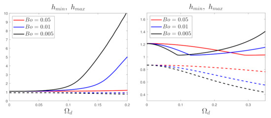 Evolution of the maximum and minimum thickness of the stationary film, as a function of the geometric parameter , for . (left) Non-rotating case (); (right) With rotation at .