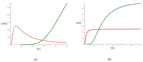 Figure 4 is, in addition, indicative of the possible phase transitions. The difference in evolution with the temperature reflected in the graphs is due to the different nature of the pseudospin. This is so since this pseudospin is responsible for the entropy and specific heat behaving at low temperatures as they do in these two graphs: great growth at temperatures less than 0.1 K in the case of dipoles (states of integer pseudospin) and no variation in the case of monopoles (states with half-integer pseudospin) in both specific heat and entropy. In addition, while the plasma state provides zero entropy in the interval