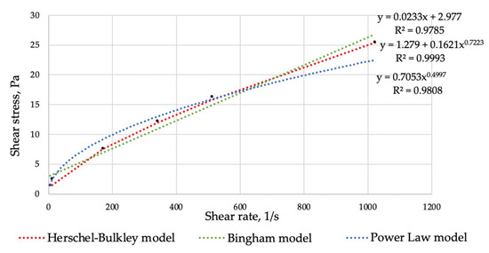 The experimental data were analyzed using the approximation method. The approximation error of these models of real WBM flow curves does not go beyond 10–11%, which is quite enough for solving engineering tasks. Obtained relationships between shear stress and shear rate, as well as the method of selecting the optimal rheological model, are shown in Figure 3, Figure 4 and Figure 5.