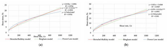 Selection of the rheological model for sample 4 with PHPA MM = 20 million (a) and for sample 5 with PHPA MM = 27 million (b).