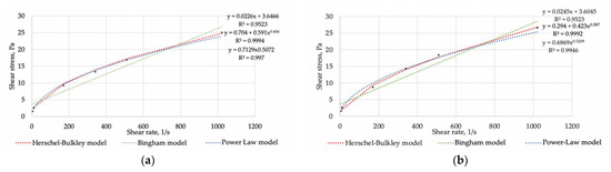 Selection of the rheological model for sample 2 with PHPA MM = 12 million (a) and for sample 3 with PHPA MM = 15 million (b).