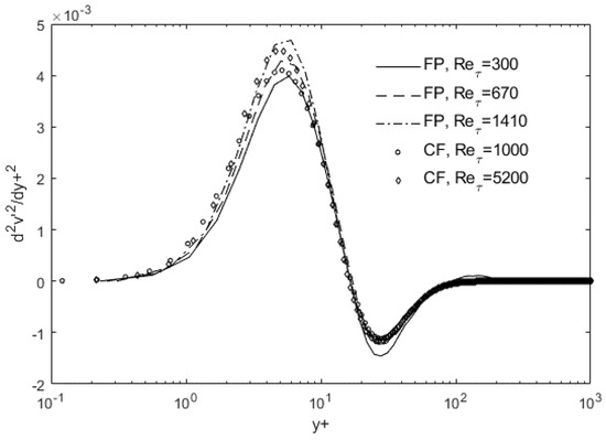 Figure 7, where once-more differentiated terms of both sides of Equation (4) are plotted and again compared with DNS data of Graham et al. [