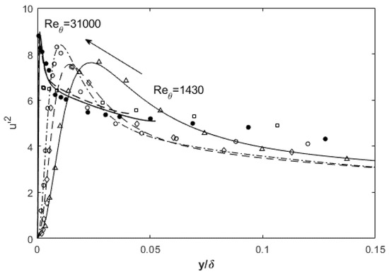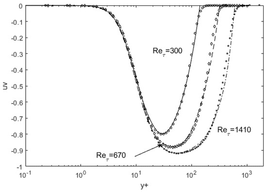 τ. Then, aft of the zero-crossing point (y+ ~ 15.4), the negative slopes on the reverse side decrease in amplitude with the Reynolds number, which inevitably produces the bend in the downward sides of u’