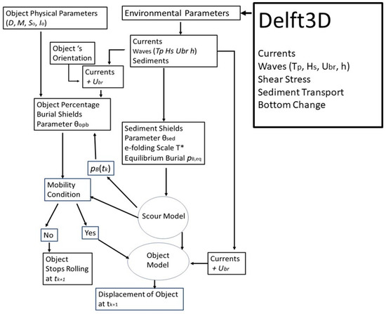 The coupled system consists of two major components: Delft3D and object model. The object model has five parts: (a) a cylindrical object model with the burial percentage Shields parameter (θopb); (b) a sediment scour model with the sediment Shields parameter (θsed); (c) an object’s physical parameters such as diameter (D), relative density versus water density (So), mass (M), and rolling moment about its symmetric axis (Io); (d) environmental variables such as near seabed ocean currents, bottom wave orbital velocity (Ubr), water depth (h), wave peak period (TP), significant wave height (HS), and sediment characteristics; (e) the model output such as the burial percentage pB, and the object’s displacement.