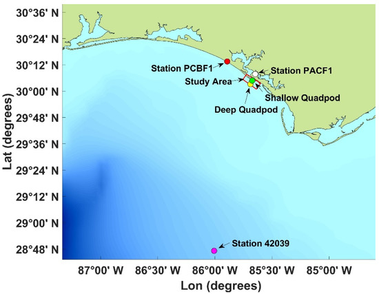 Northern Gulf of Mexico of the coast of Panama City with locations of the shallow quadpod (30°04.81′ N, 85°40.41′ W), deep quadpod (30°03.02′ N, 85°41.34′ W), and the NOAA buoy stations PACF1, PCBF1, and 42039. The study area is enclosed by the red lines. The NOAA buoy station PACF1 is nearest to the study area.