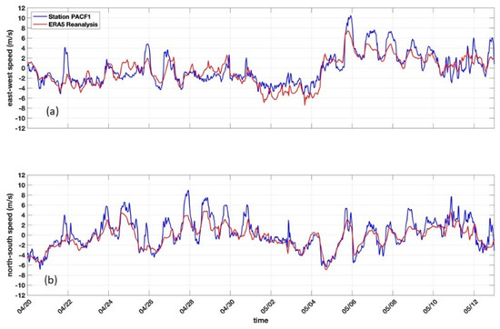 Surface (a) east-west wind component and (b) north-south wind component for the study area from the NOAA PACF1 buoy (blue curves) [18] and the ERA5 reanalysis data with 0.25° resolution from the European Centre for Medium-Range Weather Forecasts (ECMWF) (red curves) [19].
