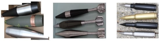 Fabricated surrogates, purchased replicas, and fabricated replicas of (left) 155 mm HE M107, (middle) 81 mm mortars, and (right) 25 mm and 20 mm cartridges (from [13]).