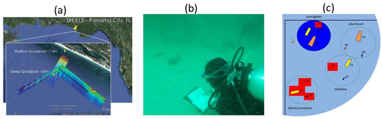 (a) Locations of deep and shallow quadpods; (b) photo of divers laying the object field during the shallow quadpod deployment; (c) layout of objects laid by divers under the shallow quadpod (from [13]).