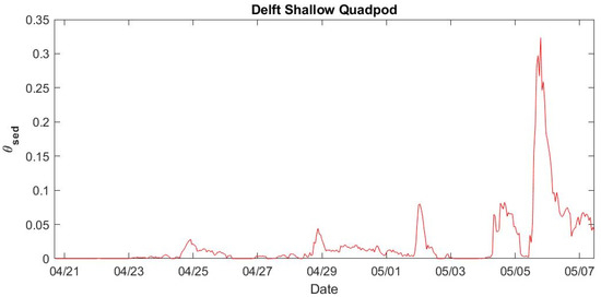 Time series of sediment Shields parameter (θsed) at the shallow quadpod computed from the Delft3D model output.