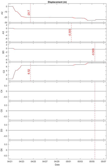 Model predicted displacement l(t) for each object at the shallow quadpod from 20 April to 7 May 2013. Among the eight objects, only A2 and C2 were immediately mobile and displaced 20.7 m (A2) and 6.52 m (C2) on 12:00 24 April 2013 (dashed line). Other munitions A5, B5, C4, C6, D3, D6 were completely motionless. According to the TREX13 report [13], the objects A2 and C2 were immediately mobile and transported out of the field of view because they were last seen on 23 April 2013. After 23 April 2013, their locations have never been observed.