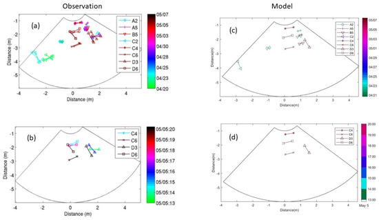 Positions for all visible objects at the shallow quadpod location up to the maintenance dive performed on 8 May: (a) observation for 20 April–7 May 2013; (b) observation for 13:00–20:00 on 5 May 2013; (c) model prediction for 20 April–7 May 2013; (d) model prediction for 13:00–20:00 on 5 May 2013. Note that Figure 13a,b were copied from [13]. The color bars denote the last time when each object was visible with dates for (a,c) and hour on 5 May for (b,d).