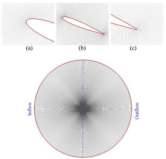Two-dimensional layout of an ‘O’-type body-fitted grid over the NACA0012 airfoil. The grid-resolution close to the airfoil is shown in the upper row: (a) leading edge, (b) full airfoil, (c) circular trailing edge. Note that we generate the orthogonal grid between the airfoil and circular outer domain of radius 30c. We numerically solved the elliptic equations as used by Ryskin and Leal [54] to compute the grid nodes.