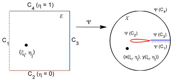 A two-dimensional orthogonal grid around the symmetric airfoil is generated using a body-fitted grid generation technique as proposed by Thompson et al. [57]. A finite-difference method is used to solve the system of coupled elliptic partial differential equations [54,57,58,59,60,61,62]. The governing equations for the generation of the two-dimensional orthogonal body-fitted grid, as used by Ryskin and Leal [54], are given by