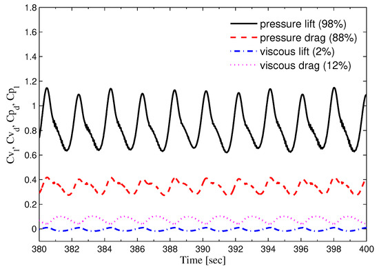 where is the spanwise vorticity component. Note that the terms for shear stress in Equation (14) diminish as the Reynolds number increases; therefore, the pressure is considered as the main source in the development of and . Figure 3 shows the time histories of pressure and viscous shear stresses components of hydrodynamic forces lift and drag at AOA = 20°. It is noted that approximately 98% of the lift and 88% of the drag are generated because of the pressure forces.