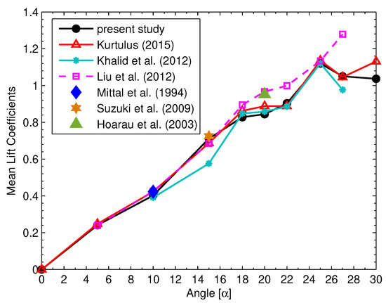 Comparison of time-averaged lift coefficients at different angles of attack with data in literature.