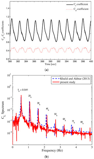 To validate the solution methodology, NACA0012 airfoil subjected to the incompressible flow field at different angles of incidence is investigated at . A mesh of size is used in this study having 257 mesh points on the airfoil surface and 361 mesh points in the radial direction with an outer domain diameter of . We simulate the flow for long enough time to reach the steady-state solution. Figure 4 shows the time-averaged lift coefficient () distribution versus angle of attack () obtained in the present study, along with the results computed at the same Reynolds number by Kurtulus [64] for 0° < α ≤ 90°, Liu et al. [65] and Khalid and Akhtar [66] for α < 30°, Suzuki et al. [67] at α = 15°, HOARAU et al. [68] at α = 20°, and Mittal and Tezduyar [69] at α = 10°. The numerical results are in good agreement with the published data, hence validating the present simulations. The time histories of Cl and Cd at α = 20° are shown in Figure 5a, and the power spectrum of Cl is shown in Figure 5b, along with the results of Khalid and Akhtar [66]. The fast Fourier transformation (FFT) algorithm is used to calculate the amplitude spectrum for the lift coefficient. Figure 5b shows that the lift spectrum has a dominant peak at fs = 0.541, and it contains both the odd and even harmonics, which indicates the existence of a quadratic, as well as a cubic, nonlinearity in the system, as observed by Khalid and Akhtar [66].