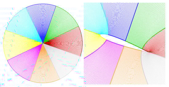 CFD of the fluid-structure problems on large mesh sizes generally involves several million degrees of freedom within each time loop to simulate the unsteady flow behavior. The demand for high-order accuracy and dealing with complex geometries increases the computational workload. Therefore, to reduce the overall computational time, we employ parallel computing of the incompressible flow over the airfoils. In the parallel implementation, the problem domain is partitioned to allocate its regions to different processing units to reduce overall execution time. These processing units simultaneously compute the results on their assigned part of the domain. For inter-process communication among the processors, we utilize the Massage Passing Interface (MPI) library. In Figure 6, a computational domain decomposed in 8 processing units is shown. The different colors represent the part of the domain to be assigned to different processing units. For a detailed implementation of the parallel algorithm, the interested readers are referred to Reference [70].