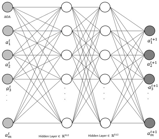 In the current work, feed forward neural network has been employed to map the past time steps to future time steps. The inputs to the neural network are the POD temporal coefficients of the pressure and velocity fields of airfoils along with the angle of attack. The basic architecture used is shown in Figure 7. The inputs are then passed through two hidden layers, and each layer has 512 neurons followed by relu activation function. For simplicity, only five neurons are shown in Figure 7. Tensorflow [71] is used for the training of neural network, which minimizes the error between predicted and the target quantities of interest (i.e., temporal coefficients) to determine the best fit parameters (weights and biases). For optimization of neural network a stochastic optimization algorithm, Adam [72] was employed. Autokeras [73] was used to find the best possible ANN architecture (number of hidden layers and neurons), which uses the Bayesian Optimization [74]. Here, 370 time steps from each case of AOA = 10°, 15°, 20° have been used to train the network, and 80 time steps were set aside for the testing purpose. Time coefficients for the case of AOA = 12° are not used for the training, but these are predicted by trained ANN. After training, the network can be used as a function, which takes AOA and past time steps to predict the future time steps, as shown in Equation (16).