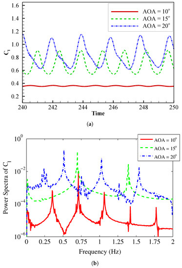 In Figure 8a, instantaneous lift coefficient is shown at AOA = 10°, 15°, and 20°. The lift coefficient at AOA = 20° is relatively higher in magnitude but oscillating about its nonzero mean value with low frequency as compared to that of the other two cases. The power spectra of Cl of the simulated cases are shown in Figure 8b. A snapshot of vorticity pattern in the wake of the inclined airfoils is shown in Figure 9. The shear layer for the case AOA = 10° is close to the surface, while, for the cases 15° and AOA = 20°, the shear layer is clearly separated.