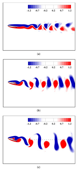 Snapshots of spanwise vorticity contours, (a) AOA = 10°, (b) AOA = 15°, and (c) AOA = 20°.