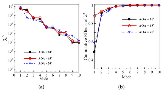Figure 10a shows normalized eigenvalues () of pressure modes. The eigenvalues represent a measure of the weight corresponding to each pressure mode. In each case, the eigenvalues do not exhibit similarity, and there exists no significantly visible pairing structures for stronger pressure modes, as is usually observed in eigenvalues of velocity modes (not discussed here). Furthermore, the values of vary significantly (in the range of 40–90%) for different values of AOA, which are increasing with AOA. Most importantly, we find that the first four pressure modes constitute over 95% of the total contribution of the system (see Figure 10b). This observation demonstrates the effectiveness of the modal decomposition based on pressure data of flow fields around the airfoil.