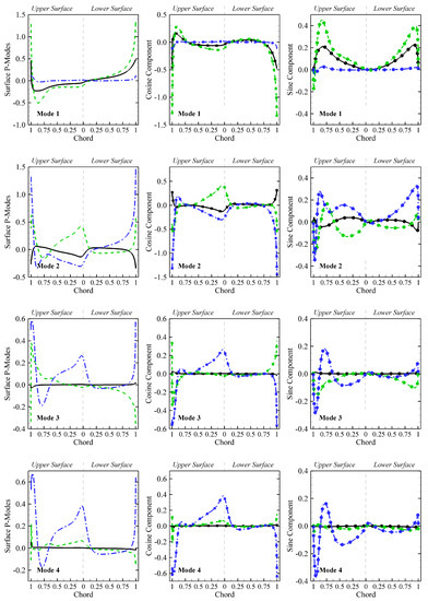 We present the mean mode (Mode 0), defined as the average of the snapshots, in Figure 11 (left column), along with the data on the airfoil surface. The decomposition of in its sine and cosine components is also depicted. Here, we represent the upper and lower surfaces of the airfoil by chord length from 1 to 0 and 0 to 1, respectively. For plots in the right column of Figure 11, the represents the trailing edge, whereas 0 represents the leading edge of the airfoil. In each case, we observed higher pressure near the edges of the airfoil and its magnitude increases with AOA. The pressure distribution over the upper surface and near vicinity of the lower leading edge is the main source to the generation of mean lift coefficient, while the pressure at the edges of the airfoil contributes to the mean drag coefficient.